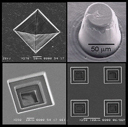 準分子激光器可以產(chan) 生大麵積方形或矩形的光斑,特別適合大麵積圖案成形工藝與(yu) 3D微加工。準分子激光器可以在相對較大的聚焦平麵範圍內(nei) 高效地加工材料,例如500mJ的UV光束在能量密度為(wei) 1 J/cm2時光斑的麵積達到7×7mm。大麵積的準分子激光束可以投射到光刻掩模上,微加工特殊的形狀和圖案;這些被稱為(wei) 近場成像。通過掩膜板與(yu) 加工工件的協調運動,可以微加工得到較大的複雜圖案,比如下圖所示的3D微加工圖案。