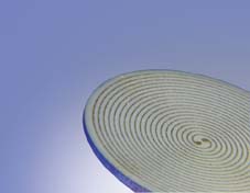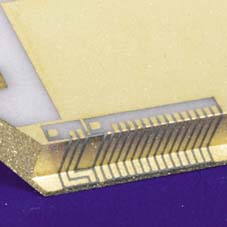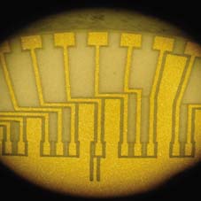 目前,法國Microcertec公司使用輸出功率60瓦的Nd:YAG激光器來蝕刻厚度不超過5微米的薄的金屬鍍層。若需要更 厚的金屬層,則在蝕刻後進行電鍍。該激光器能夠製造出極為(wei) 細小的結構元件。圖1顯示的是帶有100微米絕緣空隙的寬度為(wei) 100微米的直線軌跡。橫向分辨率 隻有幾微米。這裏顯示的互連樣式雙麵分布於(yu) 30毫米直徑的碟片外圍。燒蝕過程持續約20分鍾。