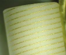 激光蝕刻是一項能夠在單片載體(ti) 的相鄰平麵上保持圖形連續性的完美技術。最具代表性的例子就是能夠生成沿著階梯的連接軌跡。圖4顯示的是位於(yu) 立麵上的保持兩(liang) 個(ge) 水平麵電氣連接的一係列導體(ti) 。激光技術還能夠生成圍繞柱體(ti) 的連續軌跡,如圖5所示。