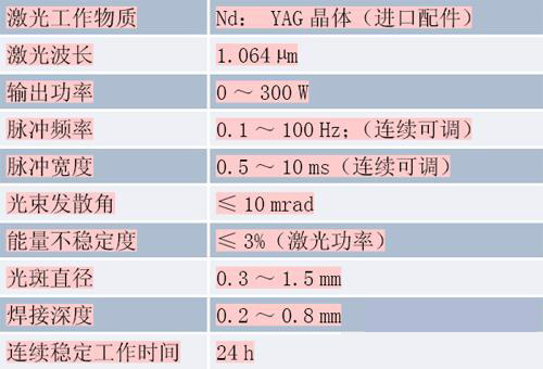 激光器係統主要由激光工作物質、泵浦氙燈、聚光腔及諧振腔組成。振鏡式激光焊接機激光工作物質為(wei) YAG棒。主要參數如表1所示。