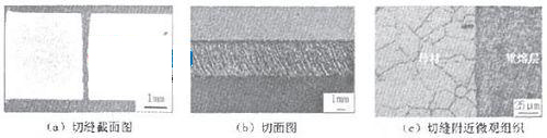我們(men) 利用500W固體(ti) 脈衝(chong) Nd:YAG激光對4mm厚AZ31B鎂合金板材進行了切割工藝研究。激光切縫窄細,上縫寬0.45mm、中縫寬0.22mm、下縫寬0.35mm,切縫垂直度為(wei) 0.05mm,切麵波紋小且分布規露。熱影響區不明顯,切縫的整體(ti) 寬度約為(wei) 空氣等離子弧切割的1/4。但是,切縫的下表麵有輕微的氧化現象,切麵有80μm厚的組織形貌為(wei) 等軸晶的重熔層。工藝研究得出的結論是:切縫寬度隨著放電電壓、脈衝(chong) 寬度、脈衝(chong) 頻率的增大而增大,切割速度與(yu) 輔助氣體(ti) 對切縫寬度的影響不大。圖1為(wei) AZ31B鎂合金激光切割宏觀形貌和微觀組織照片。