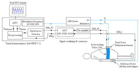 在接收機端,低噪聲放大和同步檢測確保以最小噪聲功率保存到有用信息。24位的NI USB-9239 模數轉換器(ADC) 降低了量化噪聲的影響。一旦完成數字化,信號經自適應噪聲消除器(ANC)技術處理後從(cong) 混合信號中提取胎兒(er) PPG。