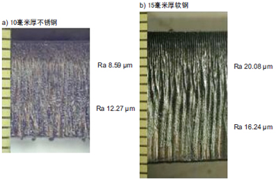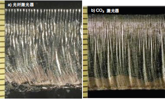 圖4顯示了 使用類似加工參數的光纖激光器和CO2激光器在加工10毫米厚的不鏽鋼中獲得的典型切割邊緣質量。與(yu) 光纖激光器相比,CO2激光器可獲得更卓越的切割邊緣 質量。利用高光度的光纖激光器在高速切割厚型鋼材時產(chan) 生的狹窄切縫實現有效的熔融噴射是有難度的,結果造成切割邊緣質量的下降。