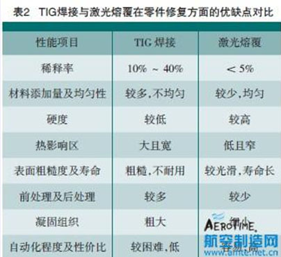 與(yu) 目前普遍采用的氬弧堆焊、電弧釺焊、線性摩擦焊、電鍍、等離子及電子束堆焊等修複技術相比,激光快速成形技術具有修複精度高、對基體(ti) 的熱輸入和熱影響小、修複層及界麵組織性能優(you) 越、自動化程 度高等優(you) 點,在航空、電力、石化、冶金、汽車等領域高附加值零件高質量修複方麵具有廣闊的應用前景[19-21]。沈陽大陸集團成功將激光熔覆技術應用於(yu) 各類渦輪動力設備關(guan) 鍵部件的修複,取得了巨大的經濟效益。表2給出了TIG焊接與(yu) 激光熔覆在零件修複方麵的優(you) 缺點對比情況,正是由於(yu) 激光熔覆在保證零件修 複質量方麵的優(you) 勢,目前正在逐漸代替TIG焊接,成為(wei) 航空發動機零件修複的重點和激光快速成形技術應用的重要方向,得到了研究及應用部門的高度重視。#p#分頁標題#e#