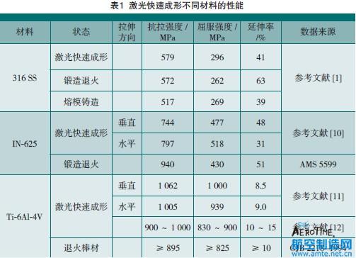 美國首先於(yu) 1995年提出高性能金屬零件的激光快速成形技術,在能源部研究計劃支持下,Sandia及Los Alomos國家實驗室率先發展出稱為(wei) LENS(Laser Engineered Net Shaping)[4]及DLF(Directed Light Fabrication)[5]的技術,研究了不鏽鋼、鎳基合金、鈦合金、難熔金屬等材料的組織及性能,並采用該技術成功製造出錸及銥的噴管[6],顯示出 該技術在高性能金屬零件直接成形方麵的優(you) 勢,並於(yu) 1998年由Optomec公司成功推出商業(ye) 化的LENS係統。隨後美國的Stanford University、University of Michigan、英國的University of Birmingham、University of Manchester、University of Liverpool及加拿大的National Research Council等也發展了分別稱作為(wei) SDM(Shape Deposition Manufacturing)、DMD(Direct Metal Deposition)、DLF(Direct Laser Fabrication)、DLD(Direct Laser Deposition)、LDC(Laser Direct Casting)、LC(Laser Consolidation)的技術[7-11],盡管各自的名稱不同,但原理和方法是一致的,係統所配備的激光器主要有CO2氣體(ti) 激光器、Nd:YAG固體(ti) 激光器(solid laser)及光纖激光器,所成形的材料包括各種不鏽鋼、鎳基合金、鈦合金等。相關(guan) 研究表明,激光快速成形的金屬零件具有致密、細小的組織,成分均勻,力學性能達到或超過鍛件水平[10-12],表1為(wei) 激光快速成形不同材料的力學性能。