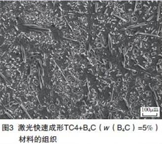 利用激光熔池 內(nei) 的原位冶金反應,可以實現原位複合材料的製備與(yu) 成形。Fraser教授領導的研究組通過激光熔化沉積TC4合金粉和B粉製備了TiB增強的鈦基複合材 料,TiB的尺寸十分細小、分布均勻,但未見關(guan) 於(yu) 所製備材料性能的報道[28-29]。通過激光熔化沉積TA15與(yu) B4C的混合粉,製備出不同 TiB+TiC含量的原位複合材料,結果表明,增強相體(ti) 積分數約9%的複合材料表現出較好的綜合力學性能[30],當增強體(ti) 含量較高時,材料的力學性能反 而變差。圖3為(wei) 激光快速成形TC4+B4C(w(B4C)=5%)所製備原位鈦基複合材料的內(nei) 部組織,材料中較為(wei) 粗大的原位析出相(TiB)嚴(yan) 重影響了複 合材料性能的提高。Liu等通過將TC4基體(ti) 預熱至500℃,避免了激光快速成形Ti-48Al-2Cr-2Nb+TiC複合材料時開裂的發生[31]。 為(wei) 發展具有良好性能的原位複合材料,需要合理選擇原位反應的材料體(ti) 係,加強對熔池的溫度、停留時間的控製,實現對增強體(ti) 的形態、大小及分布等的控製,同時 需要解決(jue) 成形開裂的問題。梯度複合材料及多材料複合結構是結合零件不同部位的不同性能需要而發展的由2種及以上不同材料組成的新型材料/結構,其顯著特點是材料和結構的不同 部位具有不同的使用性能,為(wei) 減緩不同材料之間由於(yu) 熱物理性能的不同而產(chan) 生的應力,在2種材料之間往往采用成分連續梯度的方式進行過渡。近年來,采用激光快 速成形技術發展新型的梯度複合材料和多材料複合結構正引起研究者的廣泛關(guan) 注。通過成形過程中連續改變材料組成並進行工藝調節,已成功製備出 Ti→Ti+TiC、Ti64→Ti64+TiC、Ti→Ti-60%(原子數分數)Cr、316L不鏽鋼→Ni625→Ti6Al4V、 GH163/Rene95、TA12/γ-TiAl等梯度複合材料及雙性能材料[8,32-34]。圖4為(wei) 采用激光快速成形技術直接製備的由多種材料組成 的樣件,由於(yu) 成形時較高熱應力的存在,導致開裂的發生。因此,為(wei) 發展具有應用前景的新型梯度複合材料和多材料複合結構,需要結合零件不同部位的性能要求, 通過合金材料的選擇、界麵過渡設計、成形過程凝固組織及缺陷控製,著重解決(jue) 不同材料界麵過渡區的質量和組織穩定性的控製難題。