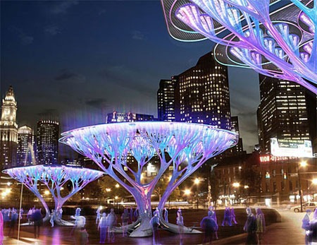 造型就像是一棵樹,Treepods采用從(cong) 回收塑料中加工得到的可降解塑料製作,樹冠上安裝有太陽能電池板,可以通過太陽能獲得電力,並能通過根部的蹺蹺 板等遊樂(le) 設施,對孩子們(men) 玩耍產(chan) 生的動能進行轉換,用作輔助電力。按照設計師的預想,Treepods至少具備兩(liang) 大功能,首先,也是最重要的,空氣淨化功 能,主要是吸收二氧化碳,排出氧氣(當然,從(cong) 科學的角度而言這種轉換能否通過人造設備實現,以及需要多大的能量才能實現,設計師沒明確說明);其次就是用 於(yu) 夜間照明,相當於(yu) 一個(ge) 太陽能路燈。