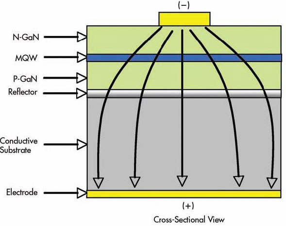 設計人員通過激光剝離(LLO)工藝可以實現垂直結構的LED,它克服了傳(chuan) 統的橫向結構的各種缺陷。垂直結構LED可以提供更大的電流,消除電流擁擠問題以及器件內(nei) 的瓶頸問題,顯著提高LED的最大輸出光功率與(yu) 最大效率(圖2)。