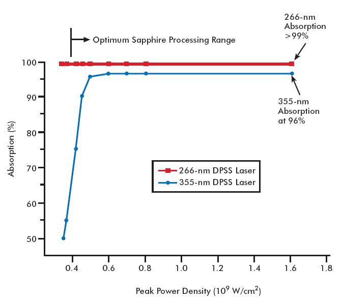 355nm的DPSS激光器可以從(cong) LED的藍寶石麵進行背切劃片。可以使用多 個(ge) 檢測相機從(cong) 正麵或背麵進行晶圓對準操作,當藍寶石有金屬反射層時這一點很重要。此外,外延層沒有直接接受激光輻射,可以降低光損。355nm波長的激光 相對於(yu) 266nm激光被藍寶石吸收的效率要低(圖6)。因此,通常需要更高的功率,從(cong) 而導致更大的切口寬度和劃道寬度。此外,背切劃片隻適用於(yu) 厚 度<150微米的藍寶石晶圓,而正切劃片還可以適用於(yu) 厚度更大的晶圓,劃片後可對晶圓研磨使其厚度變薄到裂片所需的最終厚度。