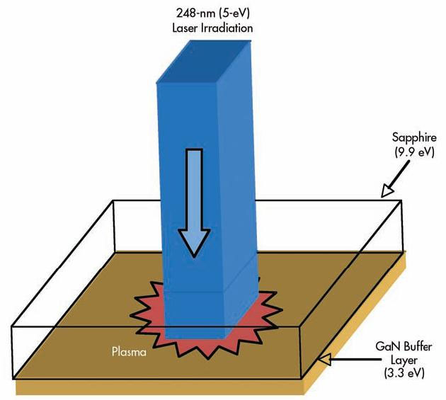 紫外激光剝離的基本原理是利用外延層材料與(yu) 藍寶石材料對於(yu) 紫外激光具有不同的吸收效率。藍寶石具有較高的帶隙能量(9.9 eV),所以藍寶石對於(yu) 248nm的氟化氪(KrF)準分子激光(5 eV輻射能量) 是透明的,而氮化镓(約3.3 eV的帶隙能量)則會(hui) 強烈吸收248nm激光的能量。正如圖3所示,激光穿過藍寶石到達氮化镓緩衝(chong) 層,在氮化镓與(yu) 藍寶石的接觸麵進行激光剝離。這將產(chan) 生一 個(ge) 局部的爆炸衝(chong) 擊波,使得在該處的氮化镓與(yu) 藍寶石分離。基於(yu) 同樣的原理,193nm的氟化氬(ArF)準分子激光可以用於(yu) 分離氮化鋁(AlN)與(yu) 藍寶石。 具有6.3 eV帶隙能量的氮化鋁可以吸收6.4 eV的ArF激光輻射,而9.9 eV帶隙能量的藍寶石對於(yu) ArF準分子激光則是透明的。