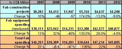 SEMI產(chan) 業(ye) 研究資深經理曾瑞榆表示:今年晶圓廠總支出將可接近472億(yi) 美元,不但高於(yu) 2010年386億(yi) 美元的總支出。同時也超越2007年的晶圓廠總支出高峰464億(yi) 美元的成績。下表一明列出了各年度的晶圓廠建置與(yu) 設備支出數字。