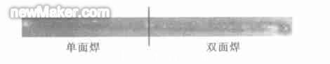 在首先進行的單麵焊和雙麵焊的對比試驗中,發現焊縫雙麵焊部分氣孔比單麵焊部分要多(如圖4 所示),這是由於(yu) ,雙麵焊接時,第二道焊對第一道焊縫進行了部分重熔,使第一道焊縫中的氣孔中的氣體(ti) 進進第二道焊縫,所以雙麵焊部分氣孔增多。因此在光束擺動激光焊接對焊縫氣孔影響的研究中,均采用雙麵焊。