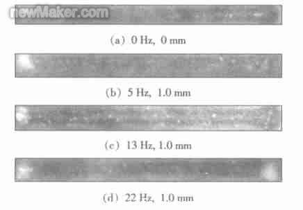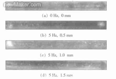 2. 1 光束擺動對激光焊接氮氣孔的影響圖2 所示的是不同擺動規範下激光焊接焊縫氮氣孔情況(X 射線透視圖) 。由圖2 可以發現,光束擺動可以起到消除氮氣孔的作用,在其它條件不變的情況下,隨著擺動頻率的增加,焊縫中的氣孔減少。
