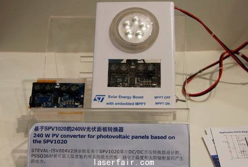 在本次展會(hui) 上,ST公司展示了基於(yu) 四相交錯DC/DC轉換器SPV1020的240W光伏麵板轉換器方案,號稱可以將太陽能板的轉換效率提高2個(ge) 百分點。