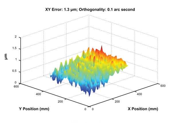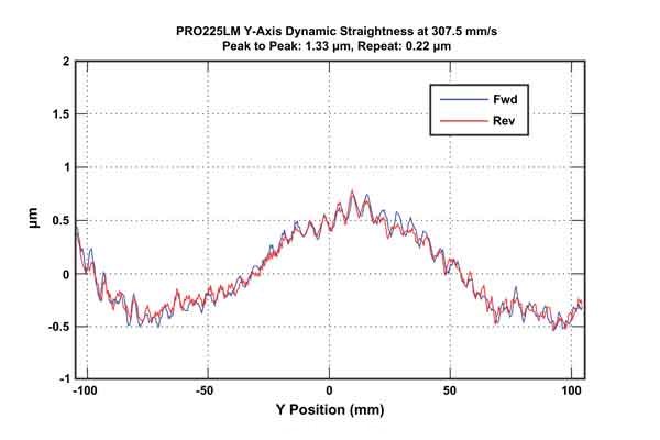 Aerotech之PRO225LM-XY (圖.1)定位平台為(wei) 單邊劃線(one-sided scribing)之理想解決(jue) 方案。內(nei) 建之非接觸式直驅直線電機提供高速,無磁滯,背隙,因此於(yu) X與(yu) Y方向可產(chan) 生更高精度與(yu) 重複性之劃線動作,並省去使用旋轉平台之需求。無鐵心之動子線圈提高大推力,並且無頓轉(zero cogging)以產(chan) 生極度平滑之速度與(yu) 位置控製,若應用於(yu) 定頻率激光觸發應用,速度穩定性對於(yu) 激光光斑之間距一致性便是格外重要。PRO225LM具有傑出的動態直線度特性(圖.2),可降低線寬並提高芯片密度。另外。可達亞(ya) 微米(Submicron)之等級之平行度,可於(yu) 激光多次掃描(multiple passes)時維持材料剝離之一致性。