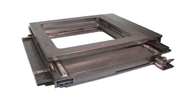 開框式定位平台為(wei) 雙麵劃線之理想解決(jue) 方案,尤其是如果需要於(yu) 底部進行視覺辨識時。ALS3600直驅開框定位平台(圖.4)具有一個(ge) 大孔徑,可應用於(yu) 最大至400mm直徑之矽片。本ALS3600係統於(yu) 設計時,采用了一整體(ti) 性的設計,並非僅(jin) 僅(jin) 將二軸疊加起來,而是以三元件式之整體(ti) 設計,如此可於(yu) 初期加工時,控製平台之重要特性如直角度,直線度,與(yu) 平麵度。此定位平台於(yu) 先天上可達到的優(you) 異直角度與(yu) 傑出之形位公差(geometrical tolerances)。ALS3600可達到之優(you) 異平行度之特性,可應用於(yu) 逐漸窄化之線寬應用,以最大化芯片密度。