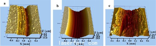 磨痕的三維形貌圖: (a) NiCrBSi/WC-Ni 複合塗層, (b) NiCrBSi 塗層,(c) 不鏽鋼基材