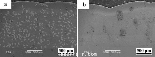 (a) NiCrBSi/WC-Ni複合塗層和(b) NiCrBSi塗層的截麵形貌圖