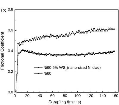 降低零部件磨耗的方法有兩(liang) 大類,一類是采用硬質材料,提高耐磨性;另外一類是采用減摩材料,降低摩擦係數。本項目通過激光非平衡合成技術,在材料表麵添加納米超硬質耐磨相(TiB2、TiC、 WC)和減摩相(h-BN, h-WS2, h-MoS2),快速合成金屬基耐磨減摩複合材料層,利用納米耐磨相和減摩相的小尺寸效應,將耐磨和減摩有機結合起來,這是表麵工程領域的一大突破。