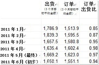 國際半導體(ti) 設備與(yu) 材料協會(hui) (SEMI)於(yu) 7月19日公布的六月份訂單出貨比報告顯示,2011年6月份北美半導體(ti) 設備製造商接獲訂單的3個(ge) 月平均金額為(wei) 15.5億(yi) 美元,訂單出貨比為(wei) 0.94。0.94意味著當月設備出貨總金額與(yu) 當月新增訂單總金額的比值為(wei) 100:94。