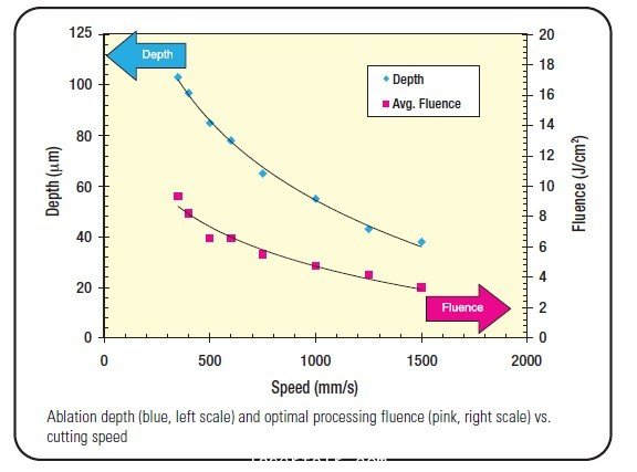 圖1. 融化深度(藍色、左側(ce) 刻度)、能量密度(紅色、右側(ce) 刻度)與(yu) 切割速度的關(guan) 係