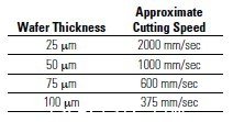 當今,商用激光器的功率級別不斷提高,這在納秒級窄脈寬355nm紫外激光器上也同樣如此,在這種趨勢下,關(guan) 鍵問題在於(yu) 如何將激光器功率與(yu) 脈衝(chong) 能量的提高盡可能充分而高效的利用到晶元刻劃工藝中。在光譜-物理工業(ye) 激光應用試驗室,我們(men) 通過實驗驗證了線狀聚焦光斑在晶元分粒高效率方麵的優(you) 勢,證實了采用短脈衝(chong) 、短波長的激光刻劃工藝不但可以得到最佳的切割質量,還能達到較高的切割速度,如下表。