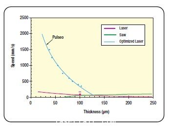 激光加工矽晶圓分粒方麵有著眾(zhong) 多的文獻,研究了從(cong) 長脈寬到短脈寬、激光波長與(yu) 加工質量與(yu) 速度的關(guan) 係。最近在薄矽晶圓采用納秒脈衝(chong) 的355nm調Q激光器分粒與(yu) 傳(chuan) 統的金剛石鋸片分粒在速度的比較方麵也有文獻發表。對照這些文獻中提及的結果,光譜-物理Pulseo 355nm 20W激光器采用線狀優(you) 化聚焦光斑技術得到的數據有著非常顯著的提高——使加工速度從(cong) 100mm/s的量級提高到m/s的量級。