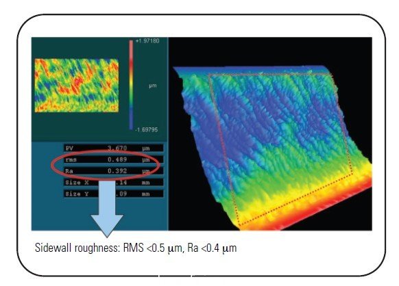 不僅(jin) 實在切割速度方麵,線聚焦光斑加工技術結合光譜-物理Pulseo激光器的短脈寬與(yu) 短波長在加工過程中獲得的非常小的熱影響區域(HAZ),是獲得高質量晶元分粒的至關(guan) 重要的因素。扁長的線聚焦光斑作用在材料表麵脈衝(chong) 重疊率更高,切縫處受激光脈衝(chong) 作用更加平均,切割效果非常整齊、平滑,切割側(ce) 壁精度更高。線狀聚焦光斑的Pulseo 355 激光器在400mm/s的切割速度獲得的樣品,97μm的切割深度處光學輪廓儀(yi) 測試表明側(ce) 壁粗糙度可達RMS<0.5μm ,Ra<0.4μm。