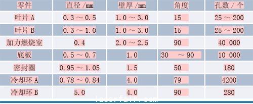 目前航空領域中用於(yu) 噴射引擎的氣體(ti) 溫度可達到2000℃,這個(ge) 溫度已經超過了渦輪葉片和燃燒室材料,即鎳合金的熔點,於(yu) 是人們(men) 一般采用邊界層冷卻的方法來解決(jue) 這個(ge) 問題,即在氣壓渦輪、噴管葉片和燃燒室表麵加工孔(見圖1),其中每個(ge) 零件上的孔從(cong) 25個(ge) 到4萬(wan) 個(ge) 不等(具體(ti) 零件的參數如表1所示),冷卻氣體(ti) 可以通過零件上的小孔覆蓋整個(ge) 零件的表麵來隔絕外界的溫度,從(cong) 而起到保護作用。