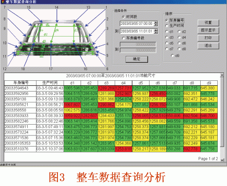 整車數據查詢是按整個(ge) 車身進行查詢,反映整個(ge) 車身的情況。整車數據查詢既可以按照車身的生產(chan) 時間進行查詢,也可以按照車身的編號進行查詢。查詢數據的列表可以采用多種排序方式:車身編號和點號、點號和車身編號、生產(chan) 時間及生產(chan) 班次等。數據的顯示采用3種不同的底色來反映測量點加工誤差的大小。