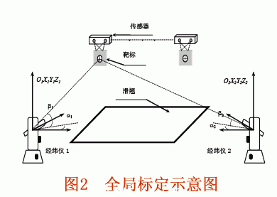 標定出從(cong) 世界坐標係到傳(chuan) 感器三維坐標係的12個(ge) 外部參數;全局標定采用的是中介坐標係方案(圖2),通過采用靶標,求出測量傳(chuan) 感器所對應的傳(chuan) 感器坐標係到經緯儀(yi) 坐標係的轉換矩陣,完成坐標係的統一。