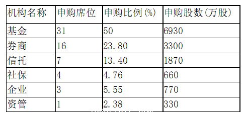 本次網上申購共有151967戶參與(yu) ,申購量達到155127.90萬(wan) 股,中簽率為(wei) 0.883142%。本次共有62家機構席位參與(yu) 網下申購,申購量為(wei) 13860萬(wan) 股。其中基金和券商機構申購量位居前列,席位數均排在參與(yu) 機構前兩(liang) 位。