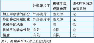 在Jenoptik自動化技術公司,基於(yu) 機械手的新一代CO2 激光係統已經誕生(其特性見表2),其激光功率能高達5000W,且具備更高精度和動態性能。在該係統中激光器以機械方式同機械手分離。通過與(yu) St ubli公司的合作,激光束現在能以光學方式同機械手底部相連,從(cong) 而將完整的激光束光路集成至激光頭的尖端。