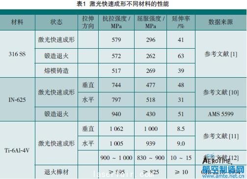 美國首先於(yu) 1995年提出高性能金屬零件的激光快速成形技術,在能源部研究計劃支持下,Sandia及Los Alomos國家實驗室率先發展出稱為(wei) LENS(Laser Engineered Net Shaping)[4]及DLF(Directed Light Fabrication)[5]的技術,研究了不鏽鋼、鎳基合金、鈦合金、難熔金屬等材料的組織及性能,並采用該技術成功製造出錸及銥的噴管[6],顯示出該技術在高性能金屬零件直接成形方麵的優(you) 勢,並於(yu) 1998年由Optomec公司成功推出商業(ye) 化的LENS係統。隨後美國的Stanford University、University of Michigan、英國的University of Birmingham、University of Manchester、University of Liverpool及加拿大的National Research Council等也發展了分別稱作為(wei) SDM(Shape Deposition Manufacturing)、DMD(Direct Metal Deposition)、DLF(Direct Laser Fabrication)、DLD(Direct Laser Deposition)、LDC(Laser Direct Casting)、LC(Laser Consolidation)的技術[7-11],盡管各自的名稱不同,但原理和方法是一致的,係統所配備的激光器主要有CO2氣體(ti) 激光器、Nd:YAG固體(ti) 激光器及光纖激光器,所成形的材料包括各種不鏽鋼、鎳基合金、鈦合金等。相關(guan) 研究表明,激光快速成形的金屬零件具有致密、細小的組織,成分均勻,力學性能達到或超過鍛件水平[10-12],表1為(wei) 激光快速成形不同材料的力學性能。