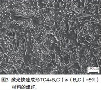 利用激光熔池內(nei) 的原位冶金反應,可以實現原位複合材料的製備與(yu) 成形。Fraser教授領導的研究組通過激光熔化沉積TC4合金粉和B粉製備了TiB增強的鈦基複合材料,TiB的尺寸十分細小、分布均勻,但未見關(guan) 於(yu) 所製備材料性能的報道[28-29]。通過激光熔化沉積TA15與(yu) B4C的混合粉,製備出不同TiB+TiC含量的原位複合材料,結果表明,增強相體(ti) 積分數約9%的複合材料表現出較好的綜合力學性能[30],當增強體(ti) 含量較高時,材料的力學性能反而變差。圖3為(wei) 激光快速成形TC4+B4C(w(B4C)=5%)所製備原位鈦基複合材料的內(nei) 部組織,材料中較為(wei) 粗大的原位析出相(TiB)嚴(yan) 重影響了複合材料性能的提高。Liu等通過將TC4基體(ti) 預熱至500℃,避免了激光快速成形Ti-48Al-2Cr-2Nb+TiC複合材料時開裂的發生[31]。為(wei) 發展具有良好性能的原位複合材料,需要合理選擇原位反應的材料體(ti) 係,加強對熔池的溫度、停留時間的控製,實現對增強體(ti) 的形態、大小及分布等的控製,同時需要解決(jue) 成形開裂的問題。