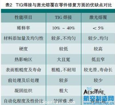 成功將激光熔覆技術應用於(yu) 各類渦輪動力設備關(guan) 鍵部件的修複,取得了巨大的經濟效益。表2給出了TIG焊接與(yu) 激光熔覆在零件修複方麵的優(you) 缺點對比情況,正是由於(yu) 激光熔覆在保證零件修複質量方麵的優(you) 勢,目前正在逐漸代替TIG焊接,成為(wei) 航空發動機零件修複的重點和激光快速成形技術應用的重要方向,得到了研究及應用部門的高度重視。