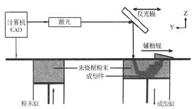 選擇性激光燒結是采用激光有選擇地分層燒結固體(ti) 粉末,並使燒結成型的固化層層層疊加生成所需形狀的零件。其整個(ge) 工藝過程包括CAD模型的建立及數據處理、鋪粉、燒結以及後處理等。SLS技術的快速成型係統工作原理見圖1。