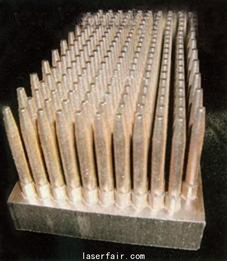 圖2 冷卻柱:通過直接金屬激光燒結僅(jin) 在30小時內(nei) 生成有著200個(ge) 冷卻柱和內(nei) 部冷流道的這種零件。在注塑過程中,冷卻柱用來更好進行冷卻和縮短生產(chan) 循環時間。節省了50%的生產(chan) 費用