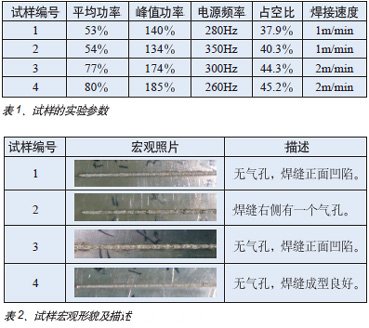 對於(yu) 一定厚度的鋁合金板材,有一最佳匹配的焊接功率和焊接速度。在一定的速度、一定的焊接功率情況下,其焊接厚度和寬度隨掃描速度的增加而減少。焊縫熱影響區也會(hui) 隨掃描速度的減少而變大。2000W的激光功率,能焊接1.8.~2.0mm厚的鋁合金材料。在這種條件下,其焊接速度約為(wei) 1.8m/min。表1、表2、表3對比了四種焊接樣品的實際焊接效果。