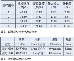 由表4可以看出,複合焊接的功率注入更小,焊接效率更高,如果不是單純追求焊縫效果的話,複合焊可以大大節約焊接成本。且對於(yu) 黃銅使用純激光焊接比較困難,采用400W激光和TIG(電流20A)複合焊接,則可以達到比較理想的效果。