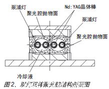 進一步的發展是把兩(liang) 個(ge) 並排的單燈單棒聚光腔做成一體(ti) ,形成雙燈雙棒雙腔聚光腔。每個(ge) 腔體(ti) 由兩(liang) 個(ge) 相同的單橢圓聚光腔並排組成,每個(ge) 單橢圓聚光腔中各放置一支晶體(ti) 棒和一支泵浦燈,其結構示意如圖2。