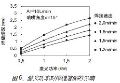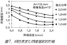 如圖7所示,根據激光功率的不同,分別在1.0、1.5、1.8、2.0KW四種不同激光功率下研究焊接速度對焊縫熔深的影響。