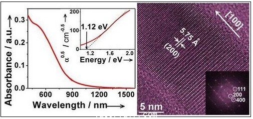 硒化錫是一種重要的IV-VI族半導體(ti) ,其體(ti) 相材料的間接帶隙為(wei) 0.90 eV,直接帶隙為(wei) 1.30 eV,可以吸收太陽光譜的絕大部分;作為(wei) 一種含量豐(feng) 富、環境友好且化學穩定的半導體(ti) 材料,硒化錫是新型太陽能電池潛在候選材料之一,因此其納米材料的合成受到人們(men) 的關(guan) 注。本工作利用溶液化學的優(you) 勢,采用晶種誘導的方法首次生長了直徑約20nm的SnSe單晶納米線,長度從(cong) 數百納米到數十微米可調。光譜表征表明,硒化錫單晶納米線顯示明顯的量子限域效應:其間接和直接帶隙分別達到1.12 eV和1.55 eV, 分別與(yu) 太陽能電池材料Si和CdTe的帯隙非常接近,顯示出該材料在發展新型太陽能電池方麵的潛力。