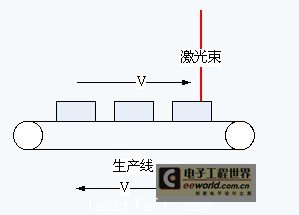 當被編碼產(chan) 品在生產(chan) 線上運動時,其相對振鏡掃描有一個(ge) 反方向速度誤差V(如圖3所示)。該速度誤差V與(yu) 生產(chan) 線的速度相等。點陣式在線激光打碼技術通過在線監測生產(chan) 線的速度來得到這個(ge) 速度誤差,並能夠根據這個(ge) 速度誤差產(chan) 生一個(ge) 補償(chang) 信號來驅動振鏡,從(cong) 而抵消這個(ge) 誤差。