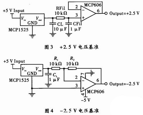 由於(yu) 使用的振鏡的驅動電壓範圍也是±5 V,在本係統中各通道的參考電壓VREF(+)和VREF(-)分別接±2.5 V。精確±2.5 V參照電壓在硬件電路設計中采用Mroehip公司的專(zhuan) 用2.5 V電壓基準源MCPl525和OP運算放大器MCP606。如圖3所示,+2.5 V的電壓基準由MCPl525產(chan) 生後,為(wei) 了降低噪音,采用了RC低通濾波和MCP606,在這裏MCP606作為(wei) 電壓跟隨器使用。如圖4所示,-2.5 V電壓則由+2.5 V通過兩(liang) 個(ge) 等值電阻和MCP606構成的分壓器產(chan) 生。