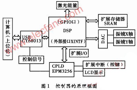 係統的原理框圖如圖1所示。振鏡式激光打標控製器主要有USB通訊電路、擴展存儲(chu) 器電路、D/A轉換電路和CPLD電路。