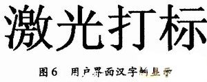 在進行圖形打標時,導入圖形文件並作圖像處理後,轉化成打標位置數據;文字打標時在VisualBasic中調用Windows API函數GetGly-phOutline得到文字的外形輪廓,可以進行放縮、旋轉等操作而不影響文字顯示質量,並通過DrawGlyph函數將其顯示效果在用戶界麵上顯示。圖6是軟件用戶界麵漢字的顯示效果。