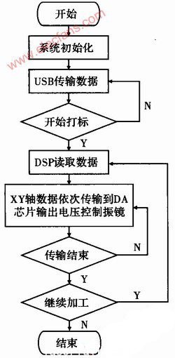 控製係統的軟件由兩(liang) 部分組成,上位機采用可視化麵向對象語言VB 6.O設計,主要負責打標數據的產(chan) 生和打包傳(chuan) 輸,以及用戶界麵實現人機交互;下位機DSP由C/C++編寫(xie) 係統程序,用TI公司提供的高效的C編譯器和集成開發環境:代碼工作室(CCS)來開發。控製係統的主要流程圖如圖5所示。