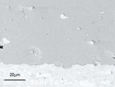 在對拋光的橫截麵的檢查中(如圖4),技術人員發現沉積所得的塗層痕跡密度很高(多孔性<0.5%),沒有可見的氧化物存在。化學分析結果證實了這個(ge) 發現。雖然,沉積處經過加熱,但是氧化物和氮化物的含量與(yu) 用來比較的CP2級別鈦板是類似的。這裏,基底變形的程度比CS塗層過程更為(wei) 明顯,這說明使用激光導致了明顯的基底軟化。#p#分頁標題#e#