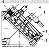 激光反射鏡有平麵反射鏡和反射聚焦鏡,用於(yu) 對激光束作90°的反射和反射聚焦。鏡片在反射激光的同時還會(hui) 吸收少量的能量從(cong) 而導致鏡片發熱,如果過熱,鏡片會(hui) 變形乃至損壞,因此,反射鏡必須有冷卻裝置,如圖5所示。2為(wei) 冷卻壓蓋,其靠近鏡片1的一端開有循環水槽,冷卻水從(cong) 管接頭3進入水槽,從(cong) 管接頭4排出,不斷地帶走鏡片1所產(chan) 生的熱量起到冷卻作用。鏡片1角度通過調整在圓周上均勻分布的三個(ge) 螺釘5和彈簧6來調節,角度調整好後,擰緊與(yu) 三個(ge) 調整螺釘相同的圓周上的緊定螺釘,發防止意外的振動。